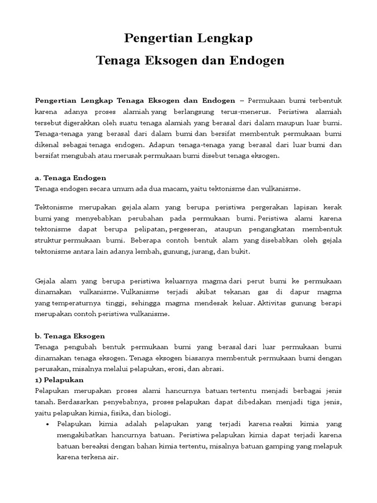 Pengertian tenaga endogen dan eksogen tenaga endogen adalah tenaga yang berasal dari dalam bumi yang menyebabkan perubahan pada kulit bumi.
